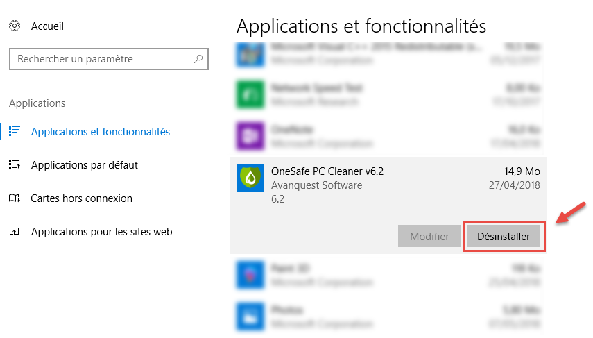 Sélectionner OneSafe PC Cleaner puis cliquez sur « Désinstaller »